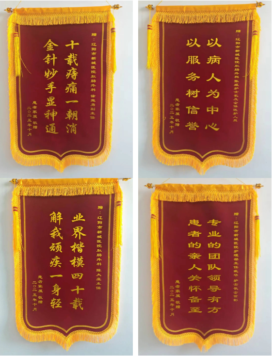 为了表达自己的感激之情,出院后他带着特制的四面锦旗来到肛肠科病房:一面赠送给陈主任,感谢他精湛的医术;一面赠送给徐医生,感谢他日日夜夜的关心;一面赠送给护士长和护理团队,感谢她们无微不至的照料;一面赠送给护理部,感谢对护理工作的规范管理。