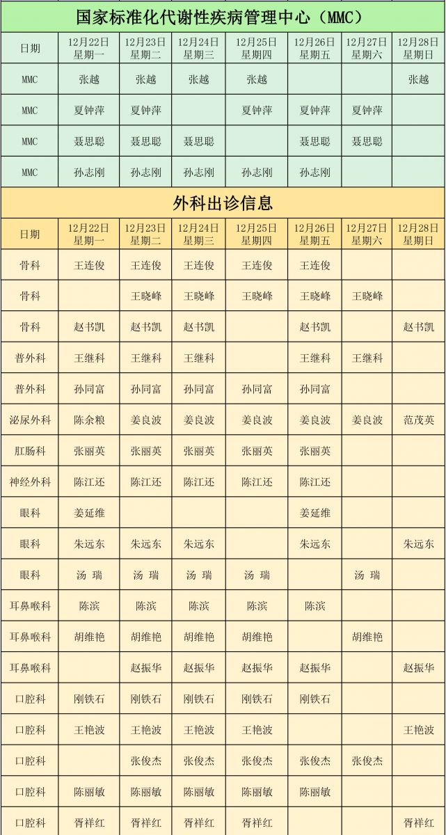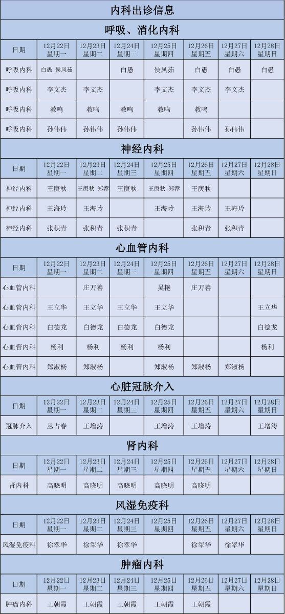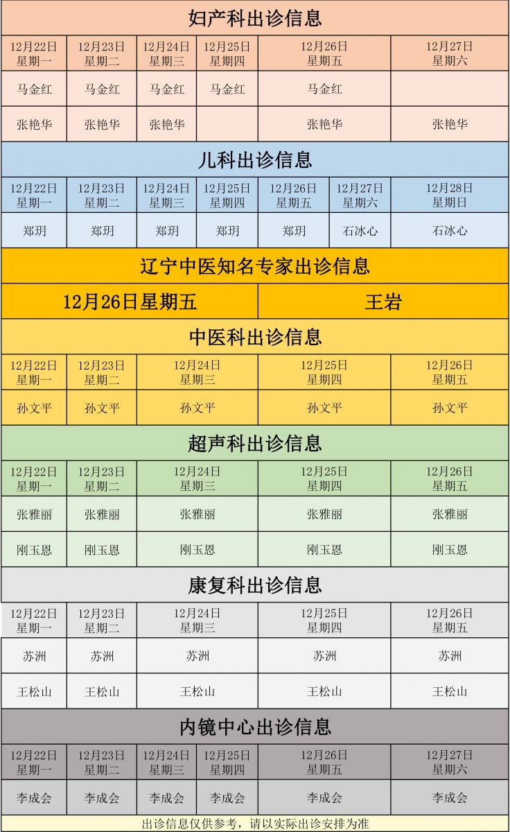 辽阳市中心医院新城医院12月22日至12月28日门诊出诊信息