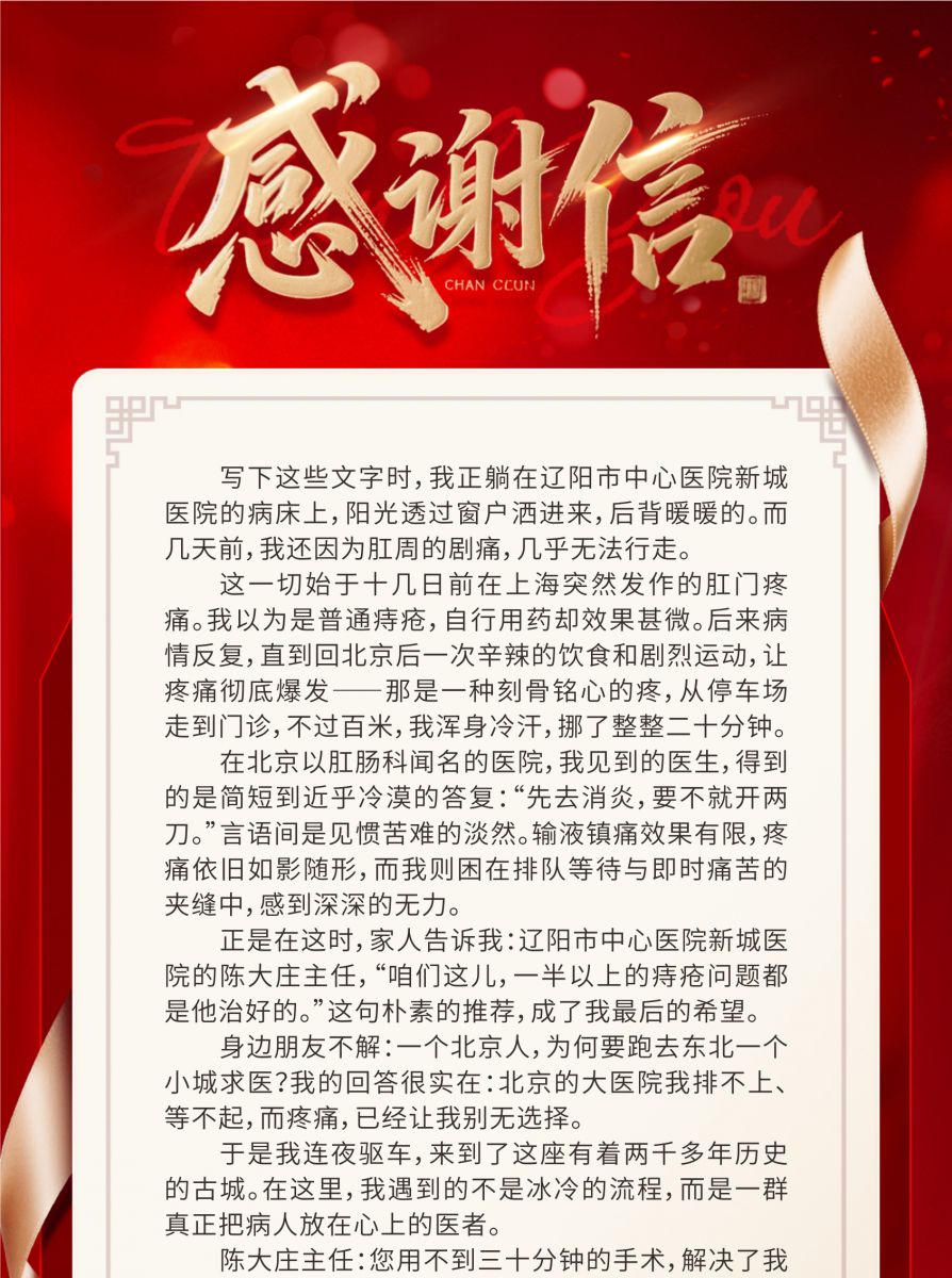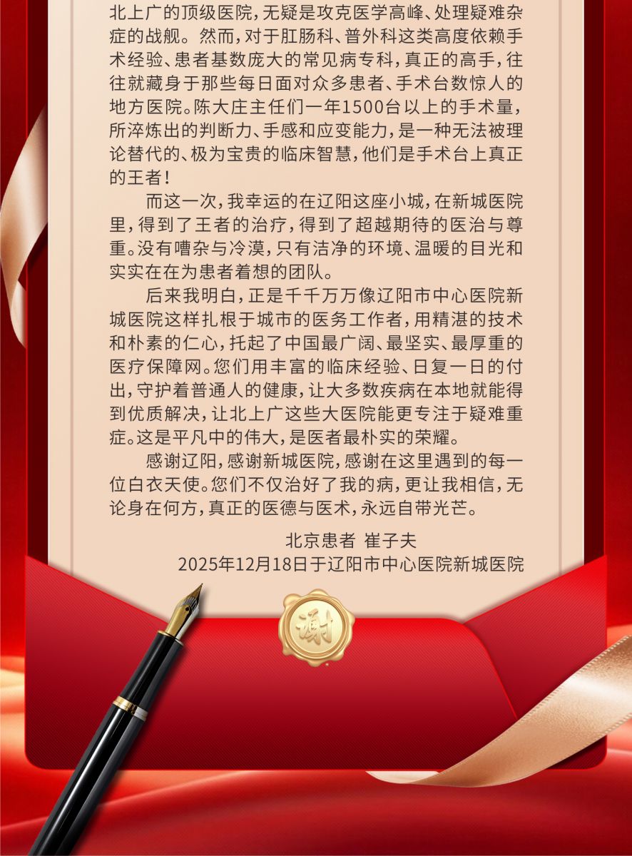一位来自北京的肛肠科患者,为何要选择深夜驱车数百公里,前往辽阳求医?近日,患者崔先生用一封亲手写的感谢信,给出了他的答案。在信中,他不仅讲述了疾病带来的“刻骨铭心”之痛,更记录下了在辽阳市中心医院新城医院所经历的、超出预期的治疗与尊重。现将感谢信的全文转载如下: