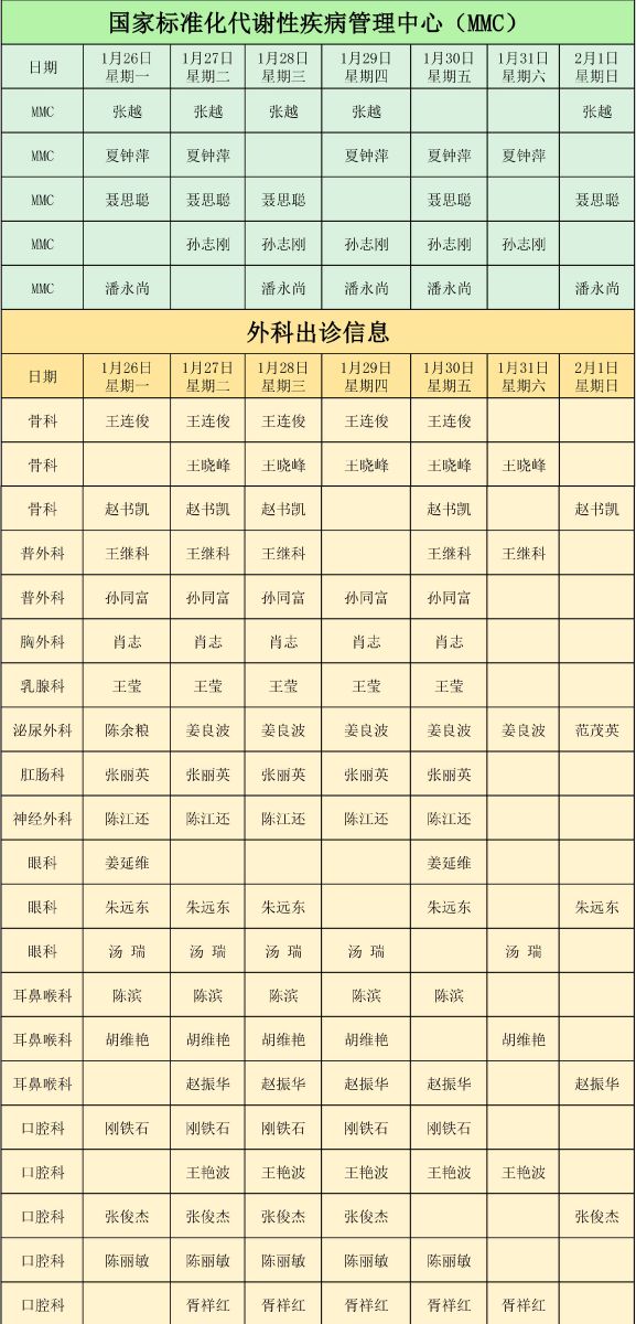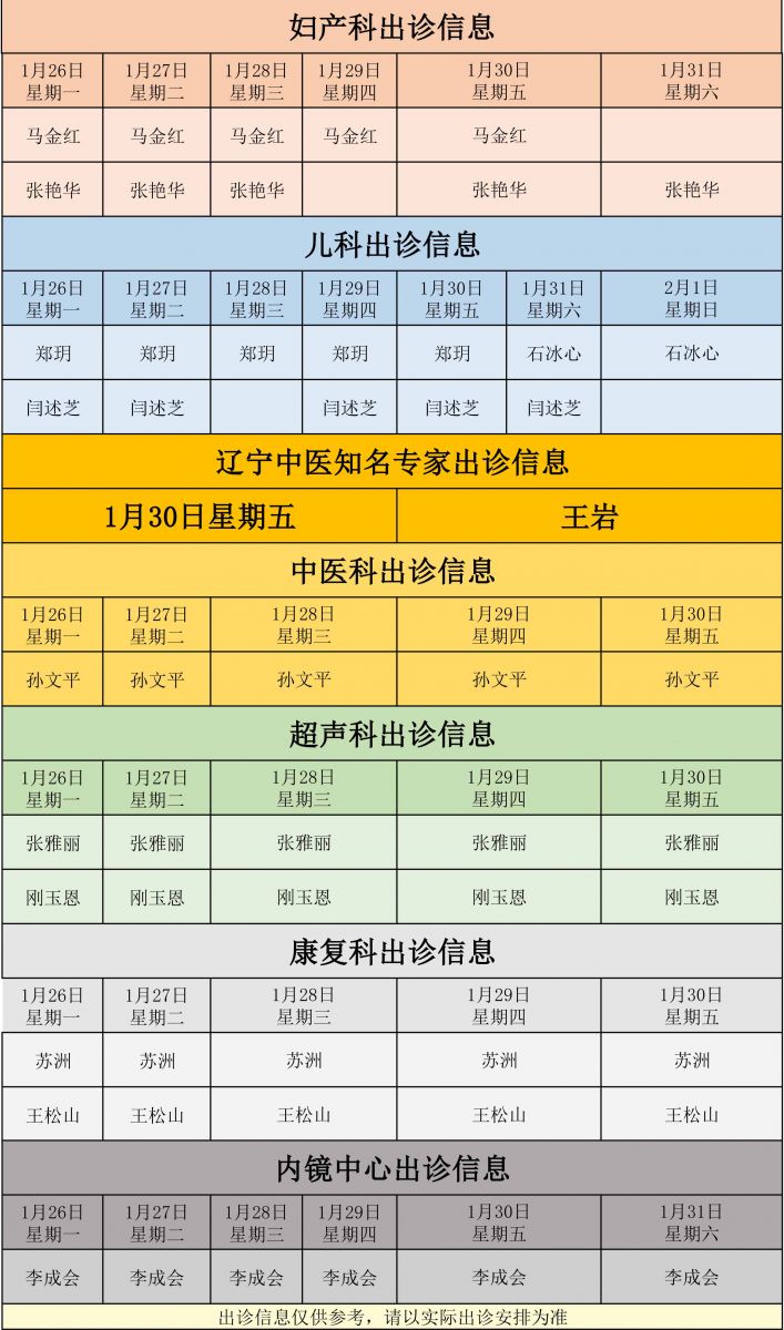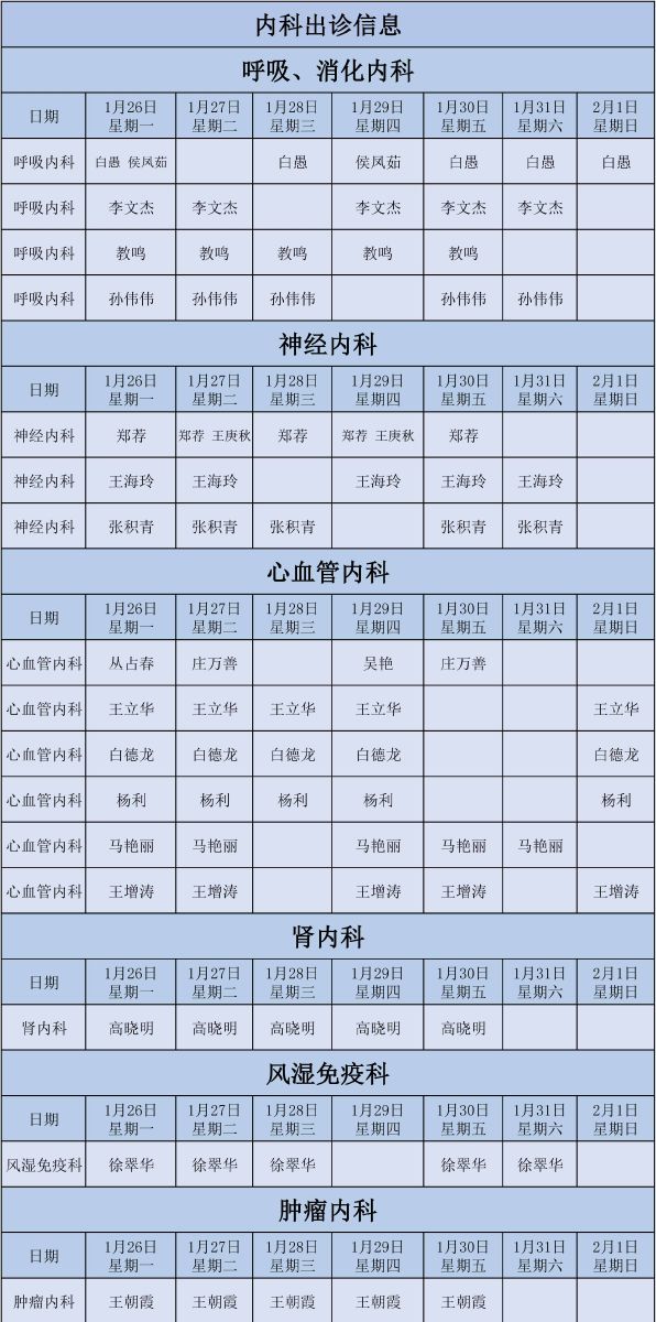 新城医院1月26日至2月1日门诊出诊信息